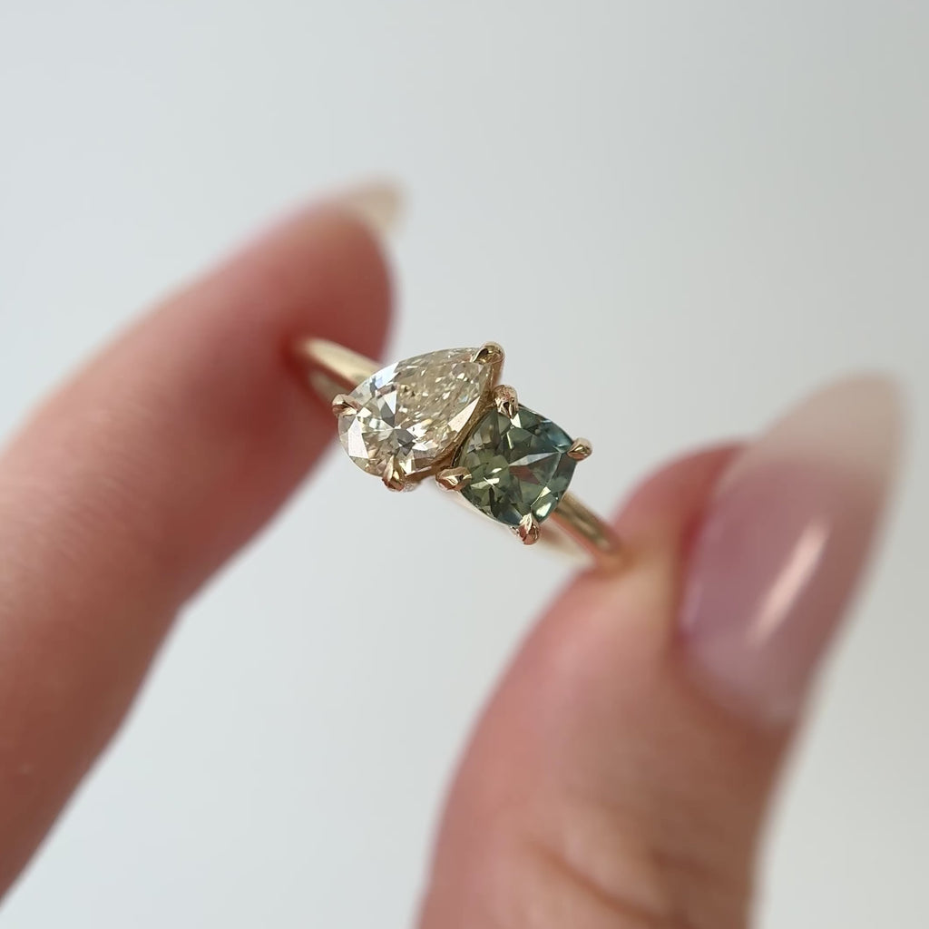 Once your stone selections have been made, I will send you photos of your two gemstones together. I personally hand select and source each pair of gems. Once approved, your ring will be custom made to order in a small Toronto studio (not a factory). Each ring is one-of-a-kind and will look slightly different from the sample ring pictured because all gem stones have their own unique dimensions and character.