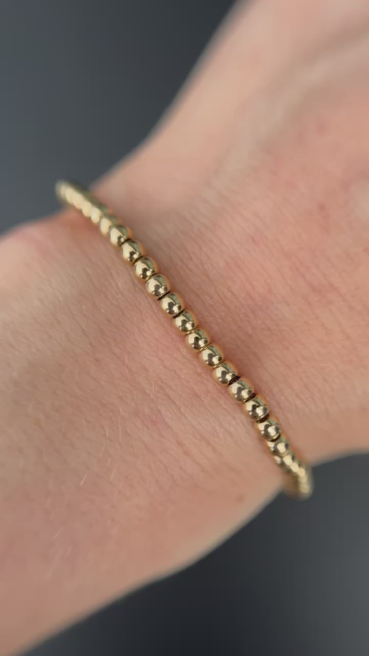 Classic bead chain bracelet in 10k yellow gold. 3.1 mm wide. Beads are solid gold but hollow on solid gold cable. Made in Italy. Perfect for wearing on its own or layering with your favourite gold bracelets.