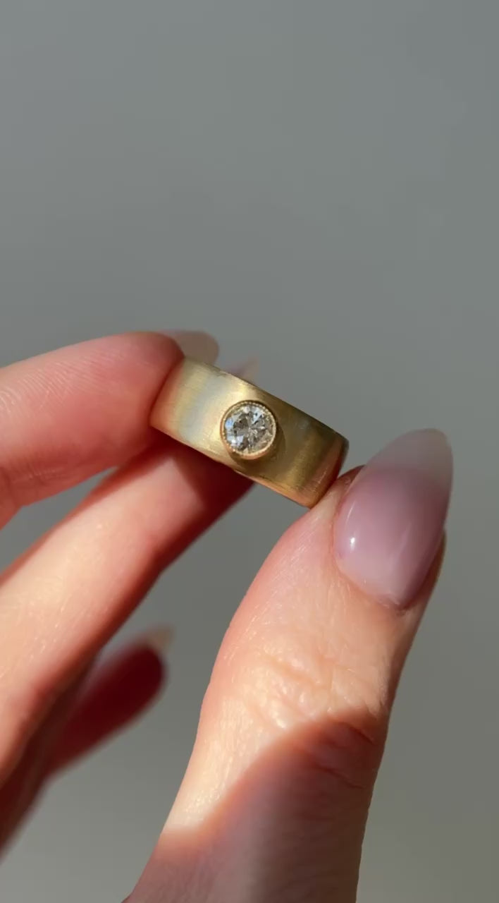We designed this modern engagement band to be fun and easy to wear. It makes a statement without being too flash and is low profile and easy to wear. The minimalist band is bezel set with a repurposed 0.47 carat antique diamond. We love how this ring seamlessly mixes old and new. It was designed to be worn as an all-in-one engagement ring and wedding band or can be paired with a matching thinner band if you prefer to pair it with a traditional wedding band.