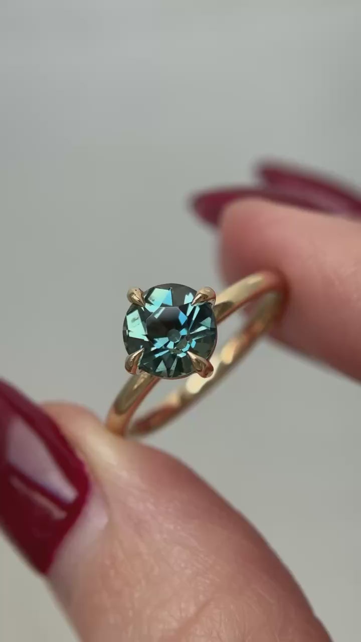 One-of-a-kind modern old mine cut sapphire engagement ring in our signature compass point setting. The teal peacock colour sapphire is vibrant and lively.