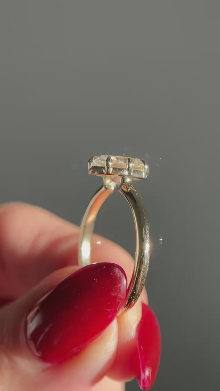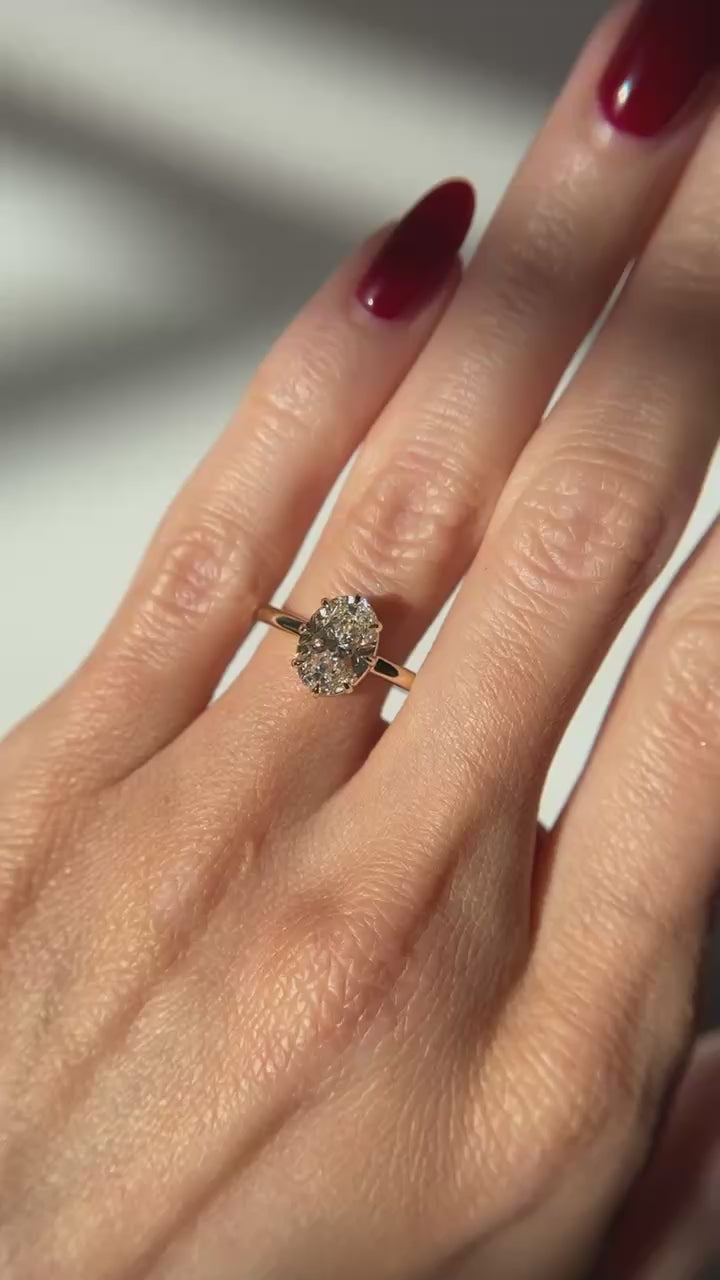 Meet Georgia, our signature floating eight claw (8) engagement ring set with an a lovely 1.50 carat oval lab created diamond. The eight (8) delicate tiger claws hold the stone in securely, while allowing another band to sit flush up beside. Designed and made in a small Toronto workshop (not a factory). The half round band is 2mm wide.