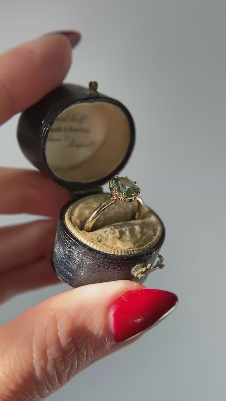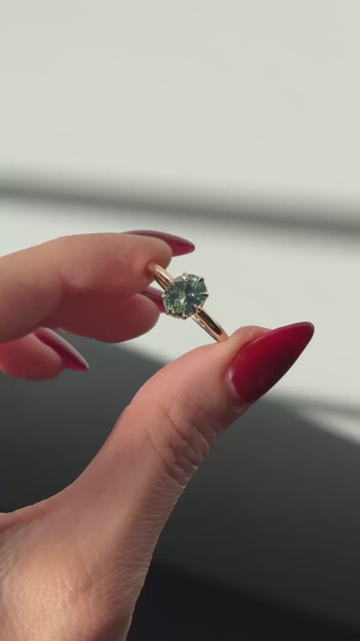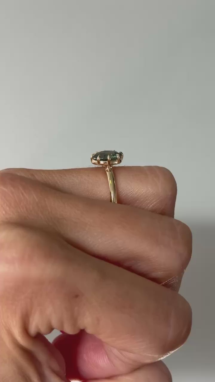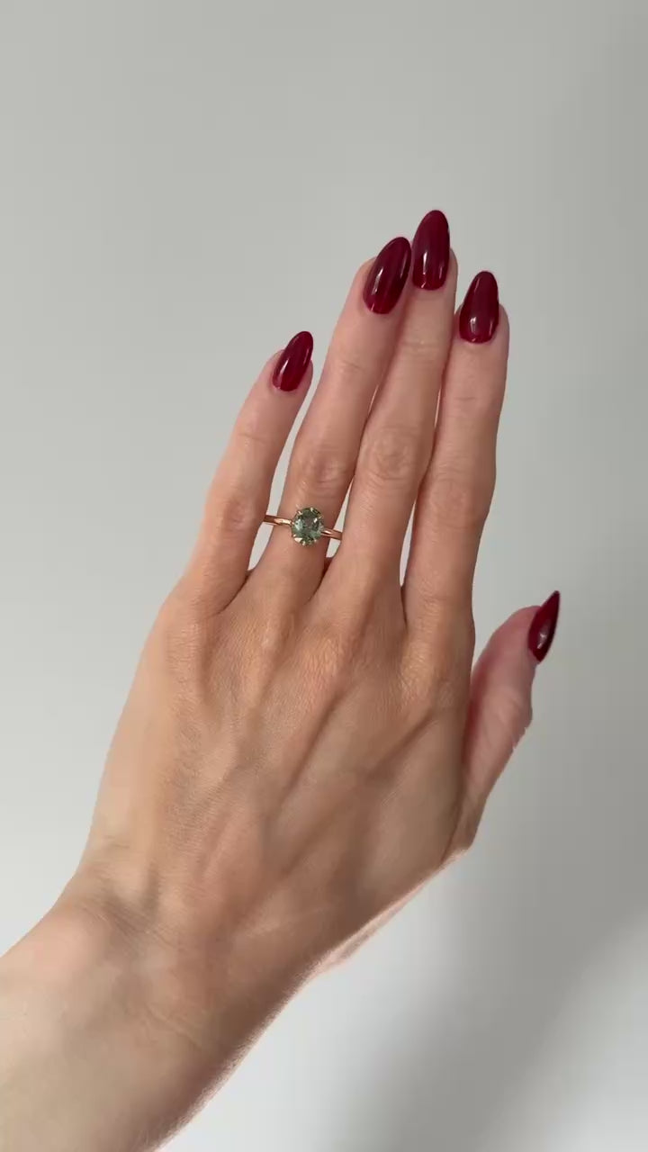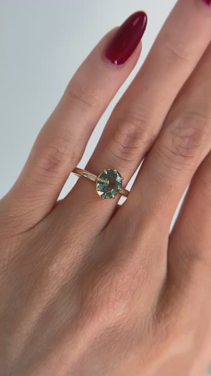 Meet Georgia, our signature floating eight claw (8) engagement ring set with an a lovely 1.53 carat natural precision cut light green oval sapphire. The eight (8) delicate tiger claws hold the stone in securely, while allowing another band to sit flush up beside. Designed and made in a small Toronto workshop (not a factory). The half round band is 2mm wide.