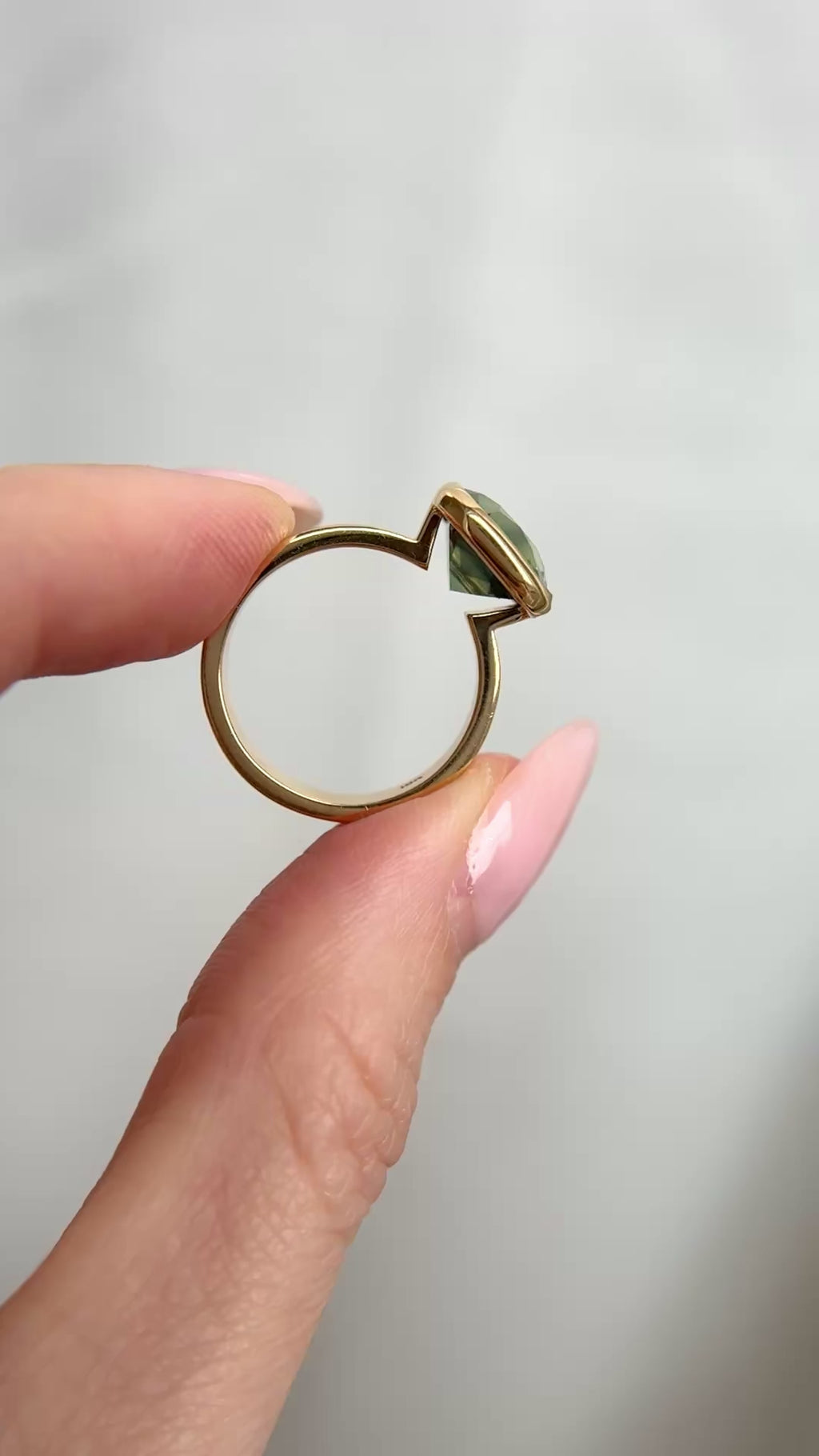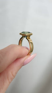 Meet our By Brockton Signature James floating bezel engagement ring set with an impressive 5.53 carat natural precision cut green cushion cut sapphire. The floating bezel protects the gem from snags and bumps, while allowing another band to sit flush up beside. Designed and made in a small Toronto workshop (not a factory). The band is 4 mm wide and 1.60 mm thick.