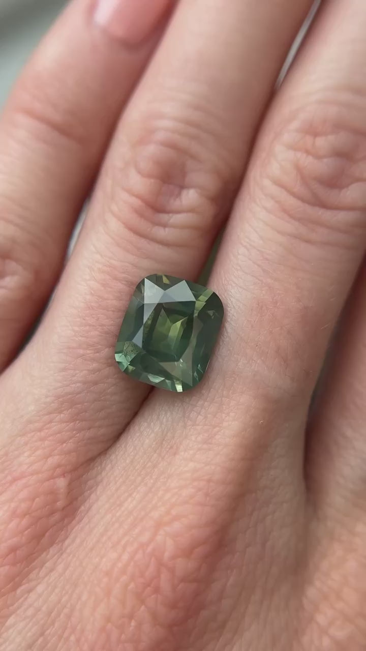 GEM 5.53 carat carat natural cushion cut green natural sapphire (10.90 x 9.40 mm). The sapphire was ethically sourced from Madagascar and has been heat treated.
