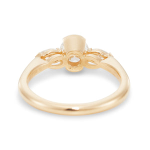 Meet the Dove, our modern take on a three-stone engagement ring. This one of a kind custom ring is set with a repurposed old European cut diamond at center, flanked by two brilliant cut pear diamonds in a semi bezel design. We love how this ring design bridges the gap between simple and modern design. The semi bezel protects the diamonds from snags and bumps, making this ring perfect for effortless everyday wear.